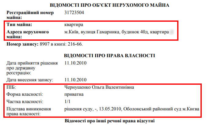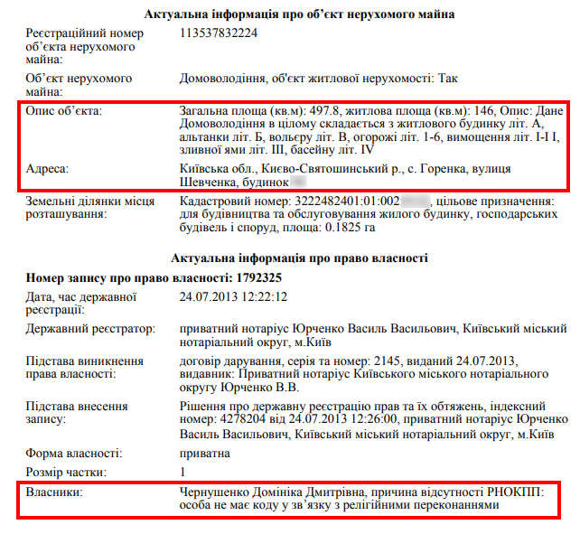 Колишнє, начебто, подружжя Чернушенків змогло нажити чималий будинок у селі Горенка неподалік Києва. Згодом його разом із земельною ділянкою 0,18 га переписали на неповнолітню дочку Домініку. У часи, коли долар був по вісім гривень, майно мало ціну 214 тис. дол. США.