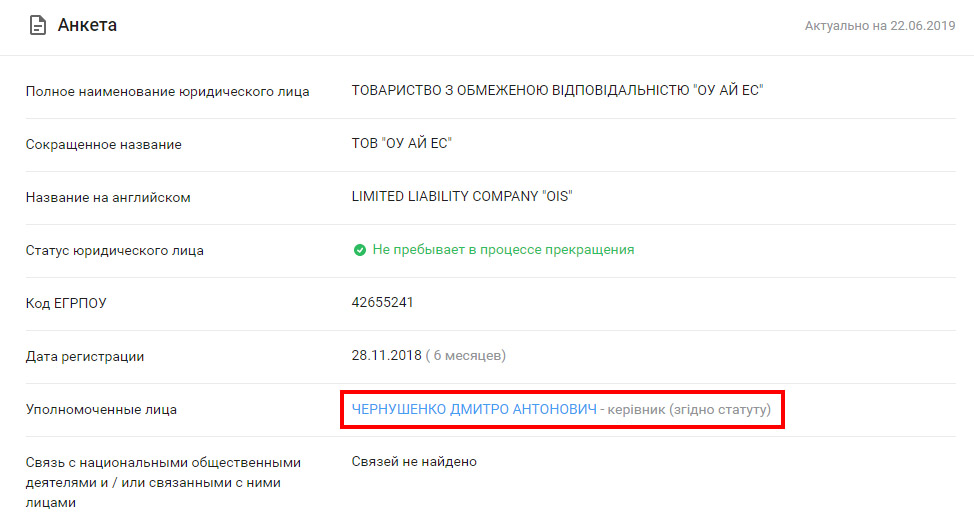 За даними реєстру юридичних осіб, Чернушенко Дмитро Антонович нині є директором створеного у 2018 році ТОВ «ОУ АЙ ЕС», що спеціалізується на оптовій торгівлі.