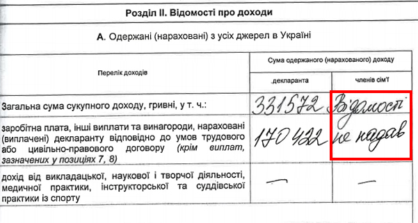 Водночас в електронну декларацію за той же звітній період чоловіка вносити не захотіла, хоча Дмитро Чернушенко, коментуючи обшуки свого будинку, заявив у 2015 році: «Вони проводили обшуки у нічний час. Погрожували моїй сім’ї, налякали малолітніх дітей».