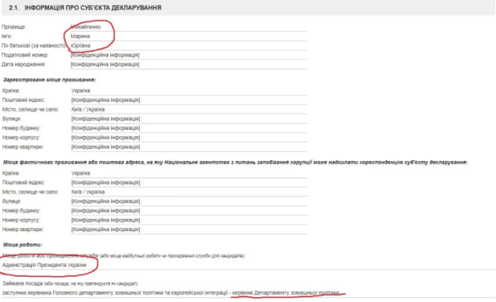 Должность же Марины Михайленко в Администрации президента легко найти уже в ее декларации о доходах.