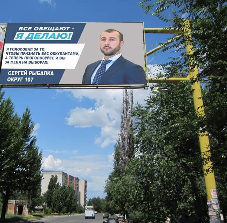 Но самое интересное - это тезис Рыбалки, который напечатан на билбордах. Он гласит: ""Я голосовал за то, чтобы признать вас оккупантами, а теперь проголосуйте и вы за меня на выборах. Сергей Рыбалки, Округ 107".