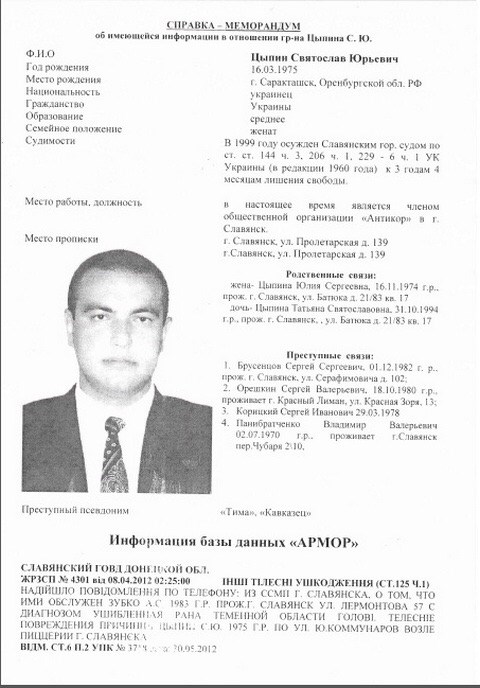 Следует уточнить, что Славик Цыпин является криминальным авторитетом, известным еще с 90-х. Тогда он был известен по кличкам «Тима-отморозок» и «Кавказец», а первый срок отсидел за вымогательство. Выйдя из зоны, «Тиму-отморозка» поставили на милицейский учет как «ранее судимого» и «потребляющего наркотики».