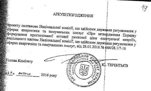 В феврале 2016 года председатель АМКУ Юрий Терентьев единолично согласовал проект решения НКРЭКП №289, которым была введена так называемая формула «Роттердам +». В дальнейшем это позволило зампредседателю комитета Марии Нижник, которая по распределению отвечает за рынок электроэнергии, отказать государственной компании «Энергоатом» в рассмотрении дела о нарушении НКРЭКП законодательства об экономической конкуренции (письмо с подписью Нижник и письмо согласования Терентьева здесь). При этом Нижник признала, что благодаря постановлению НКРЭКП тариф тепловой электрогенерации вырос с 88 до 177 копеек за кВт*час. А тариф атомной генерации в этот период вырос всего с 47 до 57 копеек. То есть произошло перераспределение средств энергорынка в пользу ТЭС, которые на 80% контролируются группой ДТЭК Рината Ахметова.