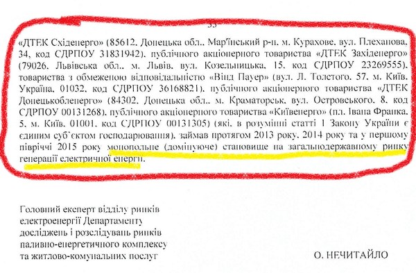 В 2016 году первая заместитель председателя АМКУ Мария Нижник подготовила проект решения о рынке электроэнергии, которым группа «ДТЭК» признавалась монополистом вместе с государственным «Энергоатомом». В АМКУ посчитали, что Ахметов и атомщики на двоих контролируют более 70% рынка электроэнергии. Согласно официальной Методики определения монопольного (доминирующего) положения субъектов хозяйствования на рынке, для признания коллективной монополии достаточно, чтобы три субъекта контролировали более 50% рынка. А в нашем случае два субъекта контролируют более 70%. То есть вывод о монополизме ДТЭК и «Энергоатома» напрашивался сам собой.