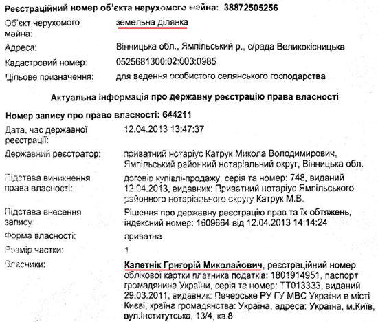 Наразі все майно селян переоформлене на Григорія Калетніка, про що свідчать витяги з державного реєстру речових прав на нерухоме майно.