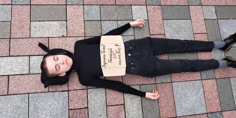 Девушка, одетая в мужскую одежду лягла на брущатку под здание парламента. На груди у девушки лежит плакат с надписью: “Останови боль! Голосуй за канабис!”.