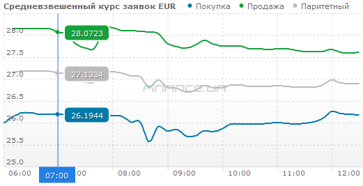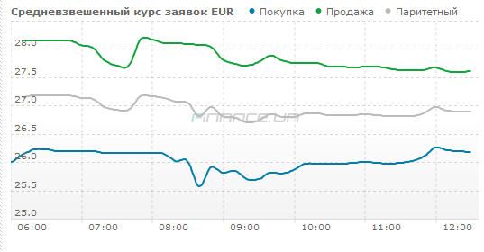 К 12:00 евро физические лица продавали по  27,67 грн, покупали по 26,10 грн.