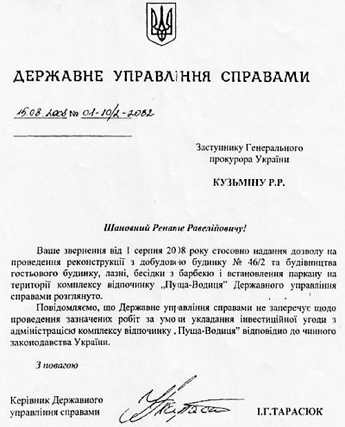 За оказание Леониду Черновецкому многочисленных услуг (в том числе по делу «Элита-Центр») Ренат Кузьмин получил от него поистине княжеский подарок. Сначала Государственное управление делами выделило Кузьмину старую дачу в Пуща-Водице, которую он снес и возвел на её месте хоромы площадью 1068 кв. метров, назвав это «рекострукцией». А затем личным участием киевского мэра этот участок (и построенная на нем «хатынка») оказались в частной собственности Кузьмина. В 2015 году Генпрокуратура пыталась признать эти манипуляции незаконными и отобрать участок, но он уже был записан на Марию Шувалову – тещу Рината Равельевича.