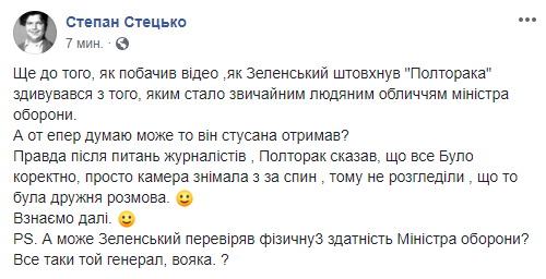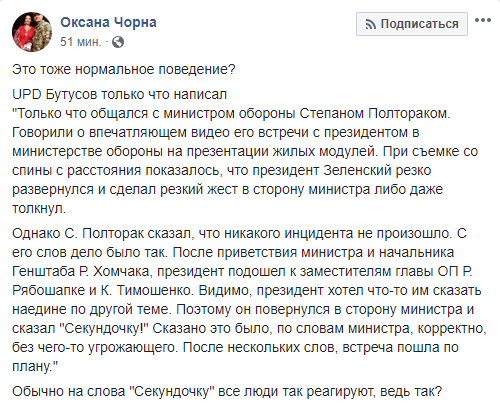 Практически сразу появился пост журналиста Юрия Бутусова о том, что президент не толкал генерала. Однако подписчики Бутусова в комментариях отметили, что они не слепые.