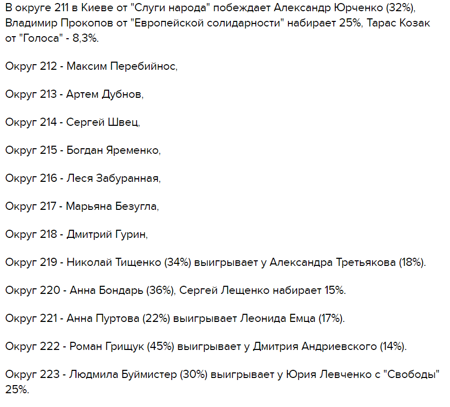 Кроме того, обнародованы предварительные результаты голосования на мажоритарных округах в Киеве: