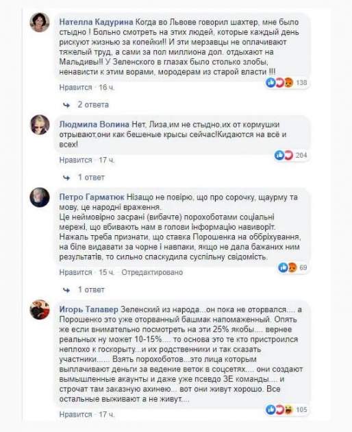 " Порохоботам стыдно за его голубую рубашку, русский язык и шаурму. Становится ясно, что для них атрибуты и пустые слова (українською) патологического лжеца Порошенко имеют намного большее значение, чем жизнь народа", — возмутилась Елизавета Богуцкая.
