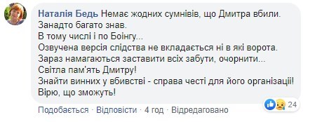 "Немає жодних сумнівів, що Дмитра вбили. Занадто багато знав. В тому числі і по Боінгу... Озвучена версія слідства не вкладається ні в які ворота. Зараз намагаються заставити всіх забути, очорнити... Світла пам’ять Дмитру! Знайти винних у вбивстві - справа честі для його організаціі! Вірю, що зможуть!", - пишет Наталия Бедь.