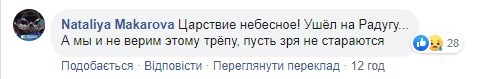 "Царствие небесное! Ушёл на Радугу... А мы и не верим этому трёпу, пусть зря не стараются", - высказалась Наталия Макарова.
