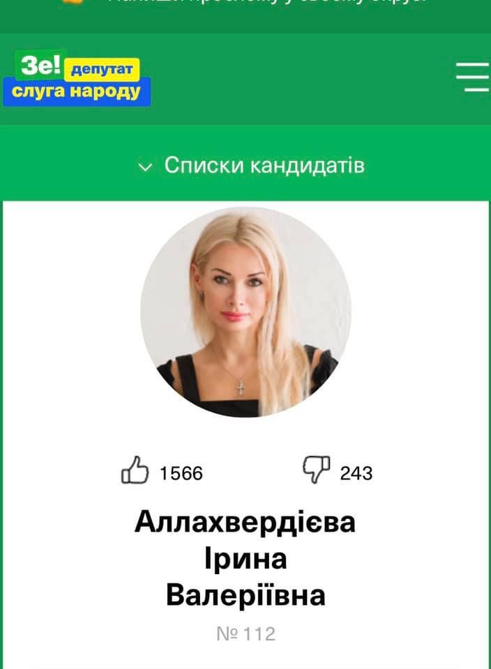 "Знакомьтесь, будущий депутат Рады от партии "Слуга народа" - Аллахвердиева Ирина Валерьевна. Женщина яркая. На тренинг для депутатов от Зе в Трускавец она приехала в сарафане Versace последней коллекции. Такое же платье-рубашка, с аналогичным броским именным принтом можно было купить за 430 евро. А сегодня вообще по дешевке - за 258 евро", - сообщила Стешенко.