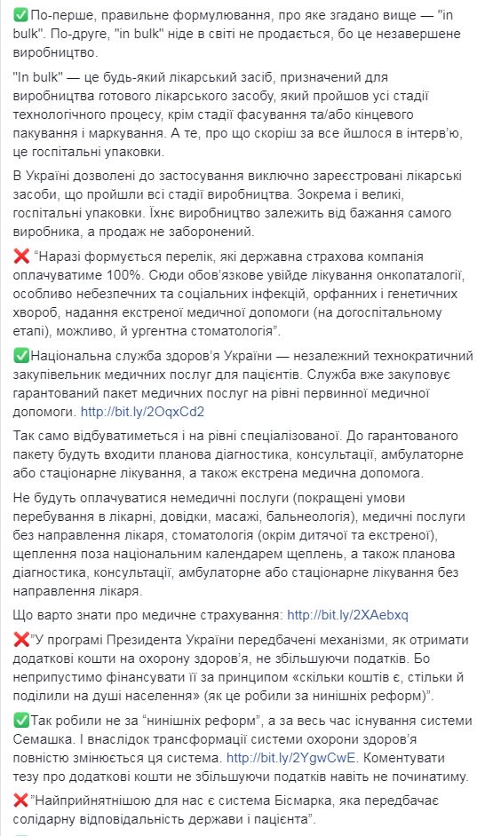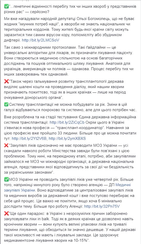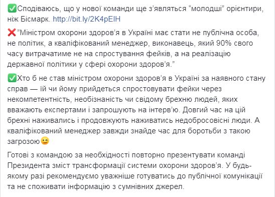 На своей страничке Ульяна Супрун прокомментировала интервью Михаила Радуцкого, отметив, что в нем есть ряд «мифов и манипуляций». Так, по поводу заявления советника президента о необходимости утверждения национальной стратегии развития системы здравоохранения, она уточнила, что такая стратегия уже существует и утверждена — ее действие рассчитано на 2015−2020 годы.