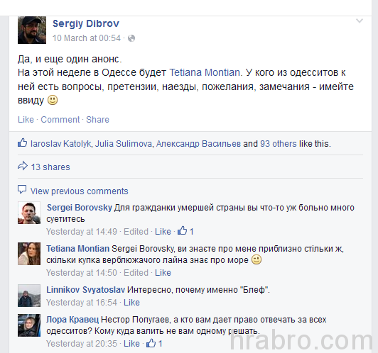 Сергей Дибров, журналист и общественный активист после сегодняшней довольно скандальной акции с присутствием на мероприятии некоторых одиозных личностей (один из лидеров партии “Родина”, депутат городского совета Г. Кваснюк, юрист и политик Т. Монтян, которая в частности имеет немало публикаций на откровенно антиукраинском ресурсе русский дозор).