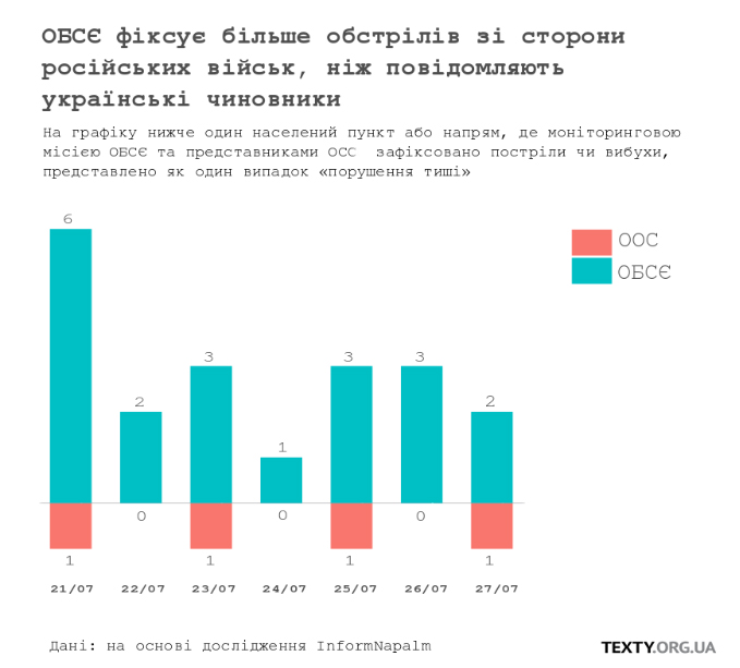 Между тем, ОБСЕ фиксирует на Донбассе совсем другое количество обстрелов. Только с 21 по 27 июля зафиксировано 20 обстрелов. Волонтерский проект Informnapalm, обративший внимание на расхождения, отмечает, что причиной этому может быть то, что ОБСЕ и штаб ООС используют разную методологию подсчетов. Однако также не исключен вариант, что украинская сторона хочет выставить перемирие в более «позитивном» свете.