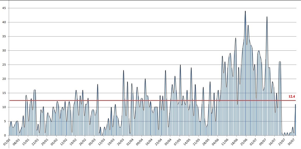За весь июль боевики, по данным штаба ООС, 457 раз обстреливали позиции украинских военных. Самое большое количество обстрелов было зафиксировано 10 июля – 42 обстрела.