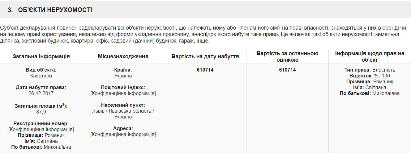 У цій саме зміні до документа Романик задекларувала придбання об’єктів нерухомості – житлового будинку та земельної ділянки у Львівській області. Сумарна вартість придбання – 1 мільйон 108 тисяч 341 гривня.