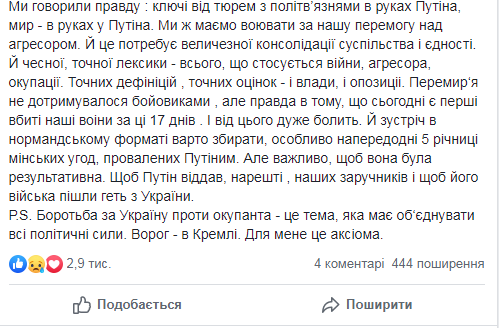 Р.S. Борьба за Украину против оккупанта — это тема, которая должна объединять все политические силы. Враг — в Кремле. Для меня это аксиома.