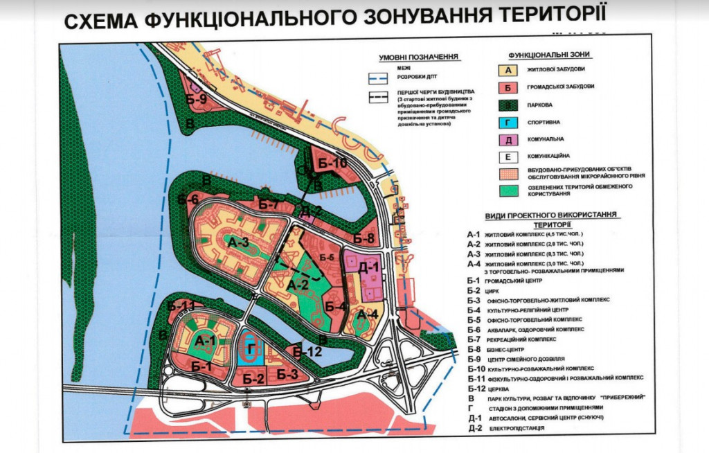 Как видно по схеме функционального зонирования территории, первый (24,5067 га) и второй участки (15,7369 га) предназначены для строительство жилых комплексов для проживания 11 тыс. человек. На третьем участке (4,5013 га) должны возвести офисно-торговельний комплекс, на четвертом (3,9616 га) рекреационный комплекс, на пятом (2,6221 га) – культурно религиозный центр в форме ихтиса – знака верующих в виде рыбы.