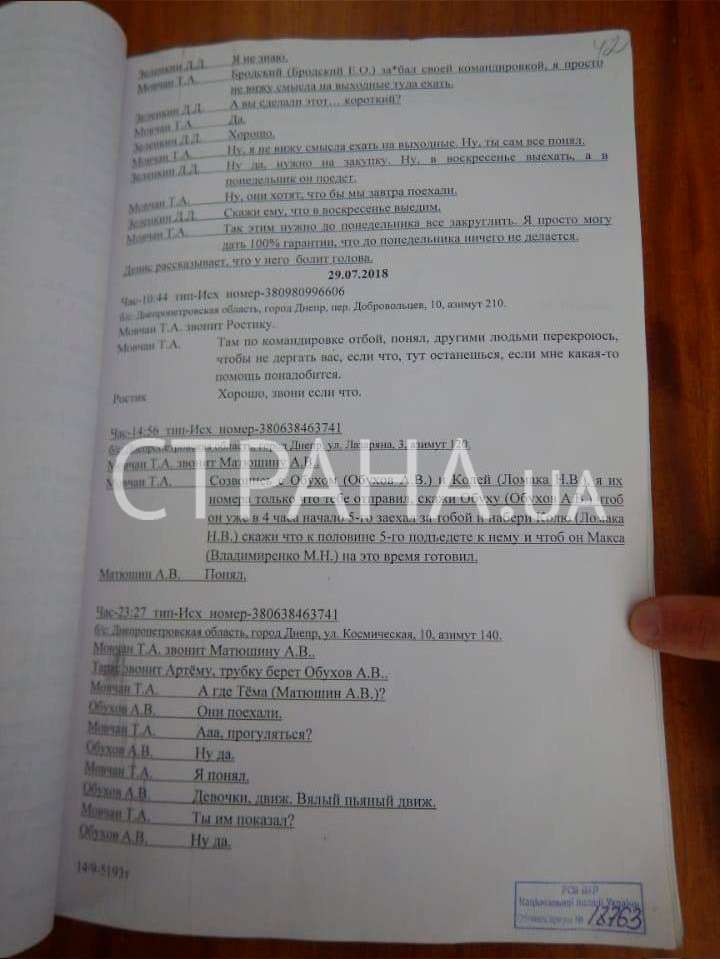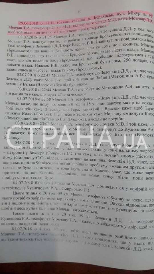 Судя по материалам прослушки, координатором днепровской ОПГ был Тарас Мовчан – именно его разговоры по мобильному телефону и прослушивала полиция. Вот разговор Мовчана с Зеленкиным 26 июля 2018 года (приводим с сокращением – Ред.). Речь идет о формировании группы киллеров из Днепра, задача которых — убить Олешко.