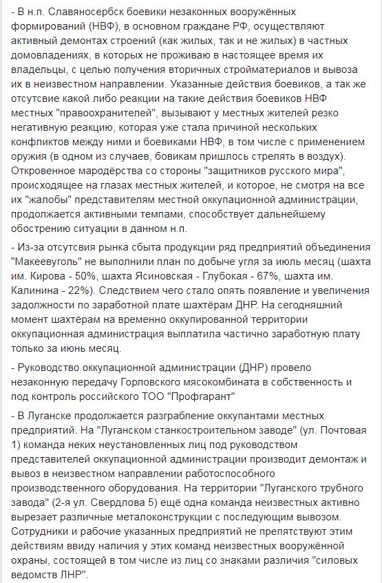 Также, по данным «ИС», в селе Безыменное (Мариупольское направление) среди местного населения упорно распространяются слухи о существенном повышении коммунальных тарифов (на 50%), а также значительном подорожании бензина. А на донецкой шахте Скочинского сотрудники администрации активно обсуждают информацию о вероятных задержках зарплаты. «Главными причинами называют отсутствие обещанных инвестиций из России и контроля за объемами добычи и реализации угля со стороны руководства шахты», — пишет Машовец.