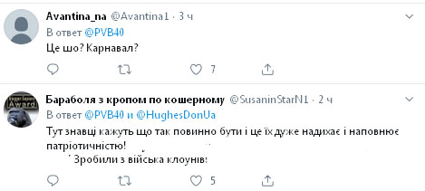 «Тут знатоки говорят, что так должно быть, и их очень вдохновляет и наполняет патриотичностью… Сделали из войска клоунов», — возмущенно написал пользователь Бараболя з кропом по кошерному.