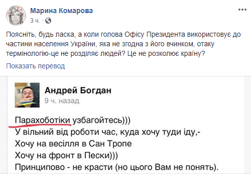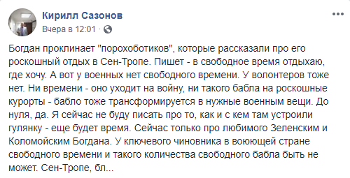 «Парахоботики узбагойтесь. В свободное от работы время, куда хочу, туда иду. Хочу – на свадьбу в Сан Тропе, хочу – на фронт в Пески», – написал он на своей странице в Facebook.