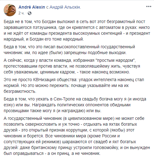 Глава Офиса Президента Андрей Богдан прокомментировал свое отсутствие на торжествах по случаю празднования Дня Независимости в Киеве неоднозначным постом в соцсети, вызвав немалое возмущение общественности.