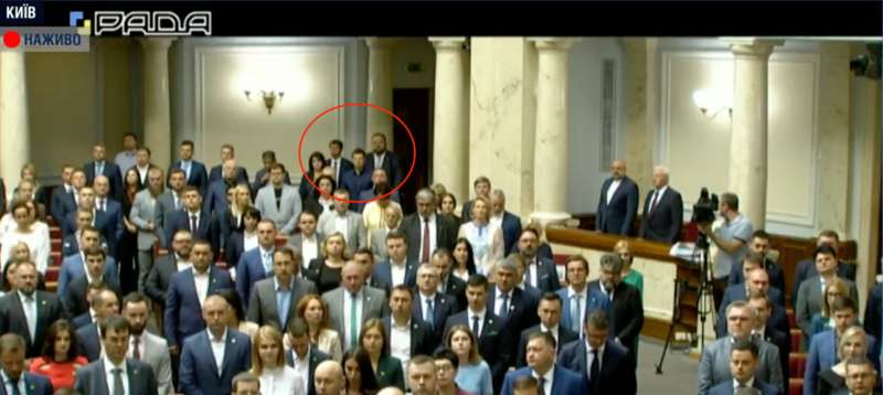 На скриншотах видео первого заседания нового состава Верховной Рады видно, что именно Разумкову и Стефанчику достались столь обсуждаемые в сети места в зале парламента.