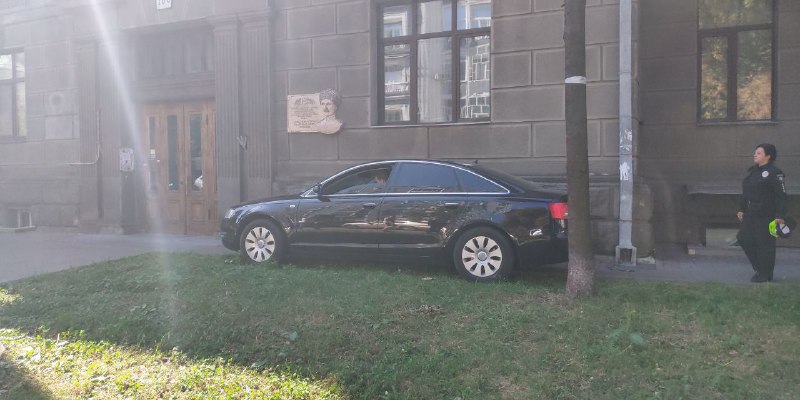 По словам очевидца, водитель авто бизнесс-класса Audi A6 был одет в форму сотрудника полиции. При этом номера на авто – гражданские. Когда представитель Нацполиции, проезжая по газону, увидел, что его фотографируют, он быстро закрыл тонированное окно автомобиля.