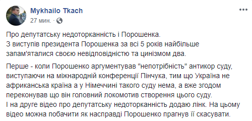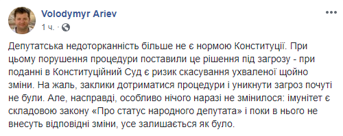 Вице-президент ПАСЕ Владимир Арьев пишет о том, что иммунитет является частью закона “О статусе народного депутата”, и пока в него не внесут изменения, решение Рады бесполезно.