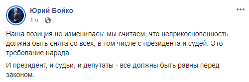 Нардеп Юрий Бойко, политсила которого (“ОПЗЖ”, – ред.) не голосовала за проект, считает, что при условии снятия неприкосновенности с депутатов, её также стоит снять с президента и судей.
