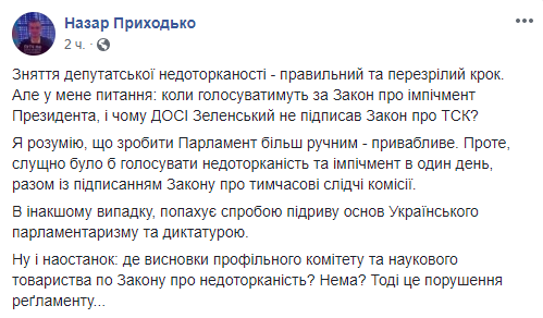 Политический эксперт Назар Приходько интересуется, когда будет принят закон про импичмент президента. И почему гарант до сих пор не подписал Закон о ВСК. Ведь несоблюдение баланса сил приведет к диктатуре. Также Приходько акцентирует на нарушении регламента Рады.