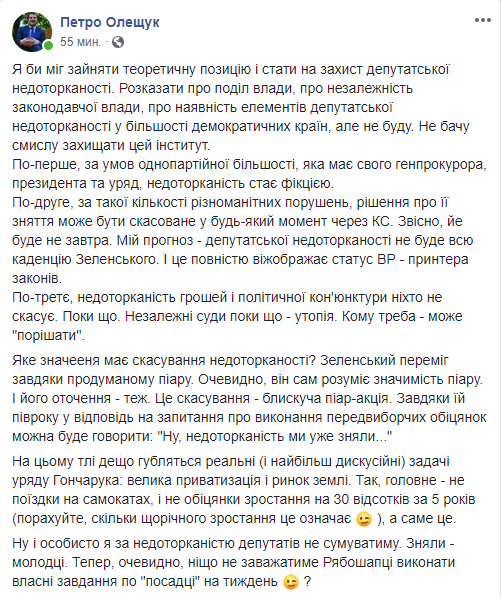 Политолог Петро Олещук назвал отмену депутатской неприкосновенности пиар-акцией Зеленского.