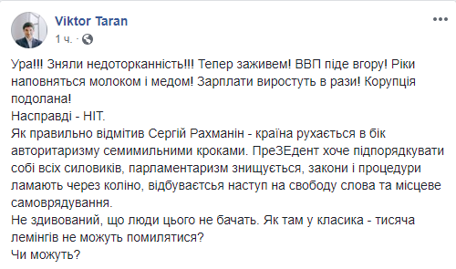 Политолог Виктор Таран считает – отмена неприкосновенности это признак того, что Украина движется в сторону авторитаризма и Зеленский узурпирует власть.