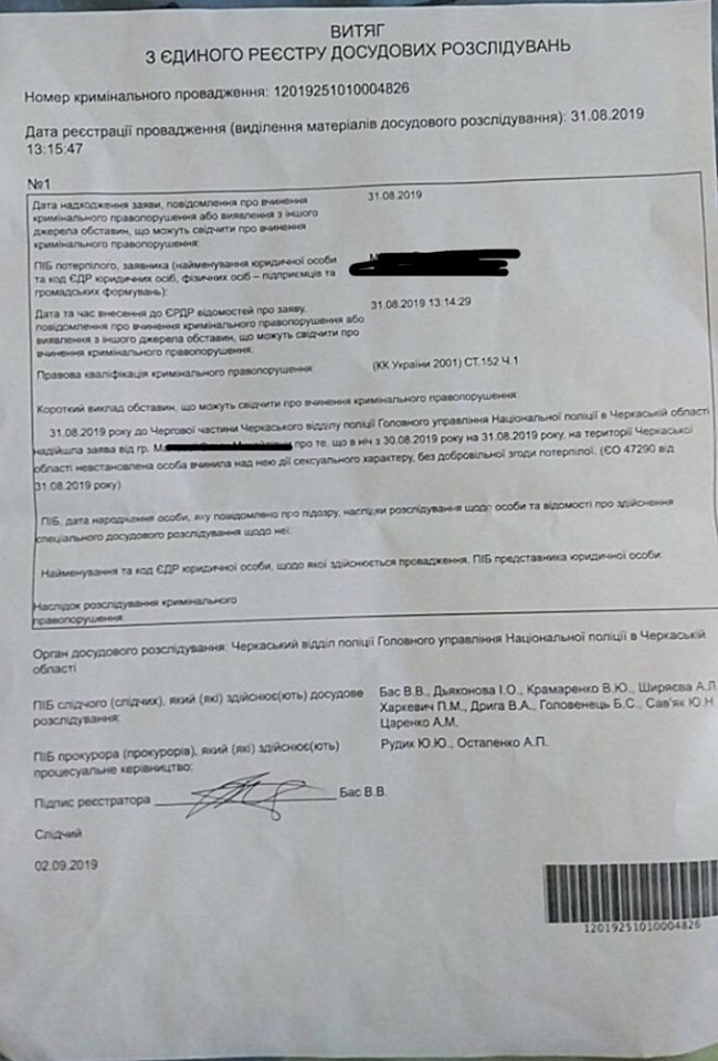 "Дело открыто по ч.1 ст. 152 (изнасилование) Уголовного кодекса, данное лицо допрошено следователем, следователь обратился с ходатайством в суд по назначению экспертизы, ведется соответствующая работа. Она обратилась 31 августа, в тот же день было открыто производство, ее одежда также была изъята в первый же день", – заявил представитель отдела коммуникации полиции Черкасской области.