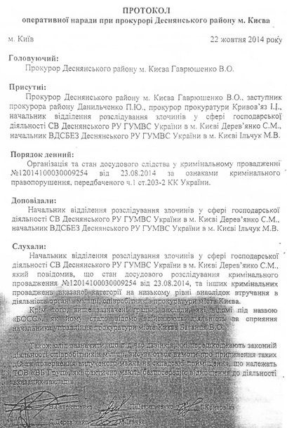 Пресс-секретарь раздает журналистам распечатку протокола оперативного совещания в прокуратуре Деснянского района, где говорится, что Баганец-младший, начальник управления прокуратуры города, поддерживает игорный бизнес.