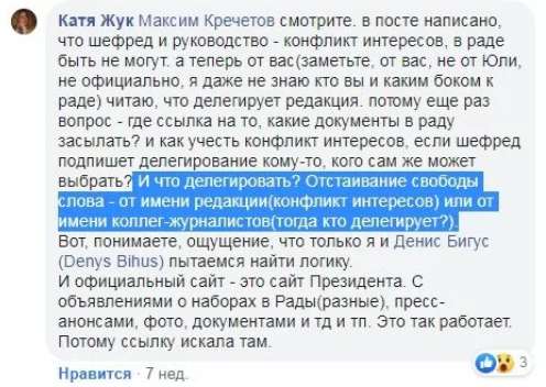 В чем состоит этот воображаемый конфликт интересов, когда руководитель СМИ будет в Раде по свободе слова отстаивать эту же свободу ни Юлия Мендель, ни Максим Кречетов ответить не смогли.