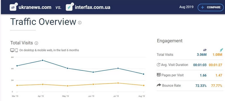 По рейтингам посещаемости открытого сайта, "Украинские Новости" опережают наших уважаемых коллег из "Интерфакс-Украина" (данные similarweb - британской платформы для анализа пользователей веб-сайтов).