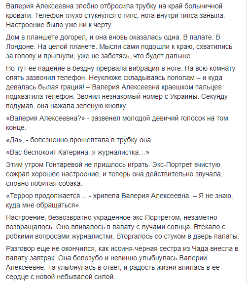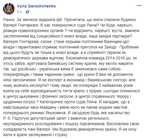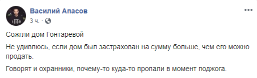 «Наш дом под Киевом в поселке Гореничи сожгли. Бросили бутылку с зажигательной смесью через забор. Дом полностью сгорел. Пожарным не удавалось его даже потушить. Это уже полное и окончательное беззаконие. Я не знаю, куда мне обращаться, террор продолжается!», – сообщила она. По словам Гонтаревой, во время пожара в доме никого не было. Никто не пострадал.