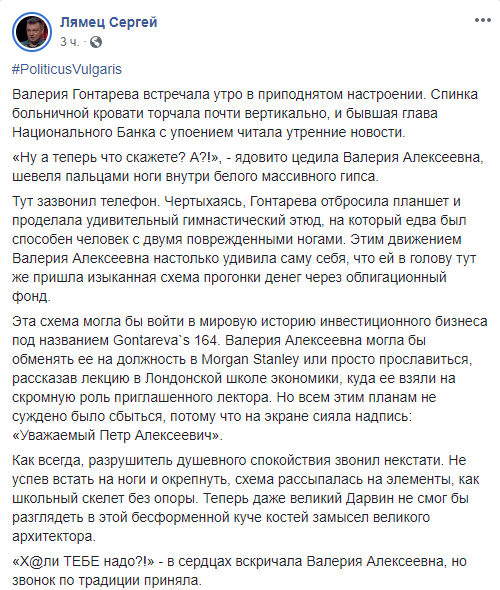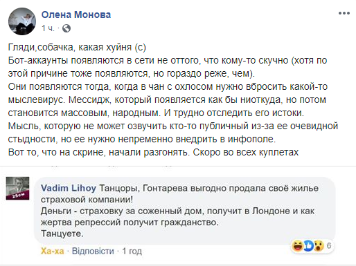 Блогер Олена Монова, активный приверженник минувшей власти, также стала на защиту Гонтаревой. Монова уверена, что мнения многих экспертов о самоподпале навязано искусственно.