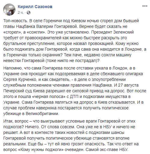 Политолог и журналист Кирилл Сазонов задается вопросом: кому нужно поджигать дом, если сама Гонтарева находится в Лондоне и напомнил, что при поджоге автомобиля её сына также никто не пострадал. Сазонов уверен, что происходящее – дело рук самой Гонтаревой, и ситуация выгодна только для неё.