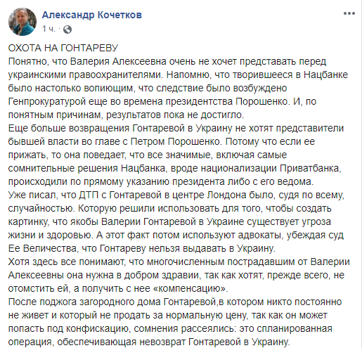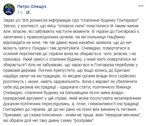 Сгоревший дом сбежавшей в Великобританию экс-главы НБУ вызвал просто цунами постов в украинском сегменте Facebook. Одни утверждают, что поджег – дело рук олигарха Игоря Коломойского, у которого с Гонтаревой давний конфликт на почве национализации “ПриватБанка”. Другие же считают: события последних дней говорят о том, что это дело рук самой Гонтаревой, которая таким образом попытается получить политическое убежище в Великобритании (якобы из-за опасности пребывания в Украине, – ред.) и избежать уголовных дел против неё.