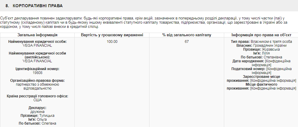 Еще судья КСУ Тупицкий задекларировал, что его жена владеет долей 67% в неком партнерстве с ограниченной ответственностью “VEGA FINANCIAL” из США: