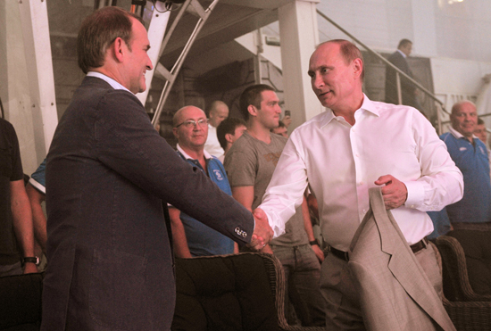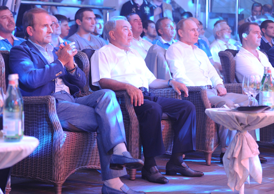 В минувшее воскресенье пресс-служба Кремля раздала фотографии, на которых видно, что Медведчук присутствовал на международном турнире по профессиональному боевому самбо в Сочи. Киевского гостя посадили в один ряд с Путиным, Медведевым и президентом Казахстана Нурсултаном Назарбаевым.