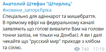 "Специально для "адиннарод" и "мышебратья". В прямом эфире на федеральном канале заявляют, что готовы вывалить вам на головы тонны железа, не только на Донбассе. А вы и дальше ждите, что "русский мир" придет с хлебом и солью", – высказался о громком заявлении офицер ВСУ Анатолий Штефан (позывной "Штирлиц").