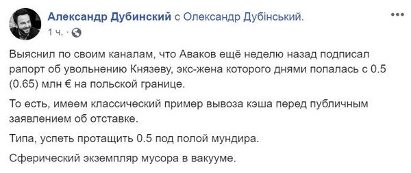 Дещо раніше, дану інформацію оприлюднив на своїй сторінці у фейсбук народний депутат Олександр Дубінський, який з власних джерел також підтвердив дану інформацію і заявив, що йому відомо про написаний Князєвим тиждень тому рапорт про звільнення з займаної посади: