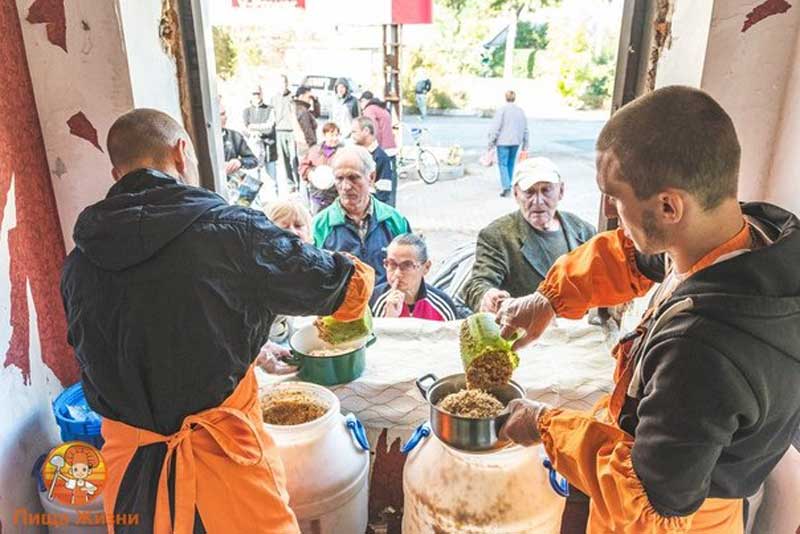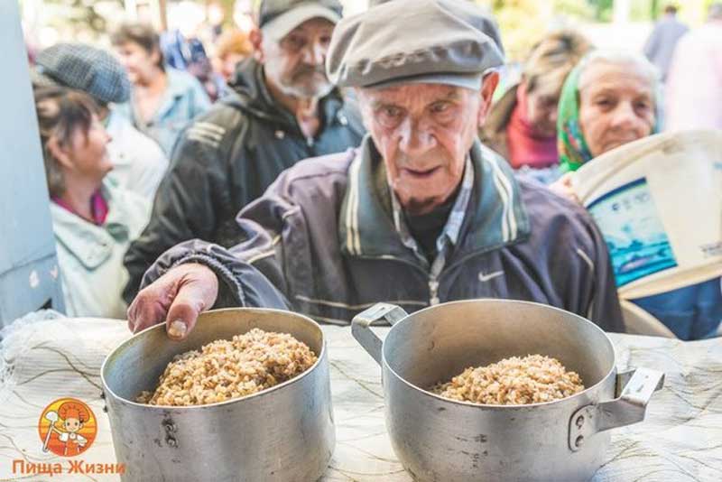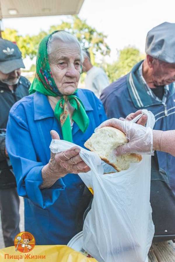 Снимки действительно удручают: на них показано, как люди пенсионного (и не только!) возраста выстраиваются в очередь для того, чтобы получить миску каши и буханку несвежего хлеба.